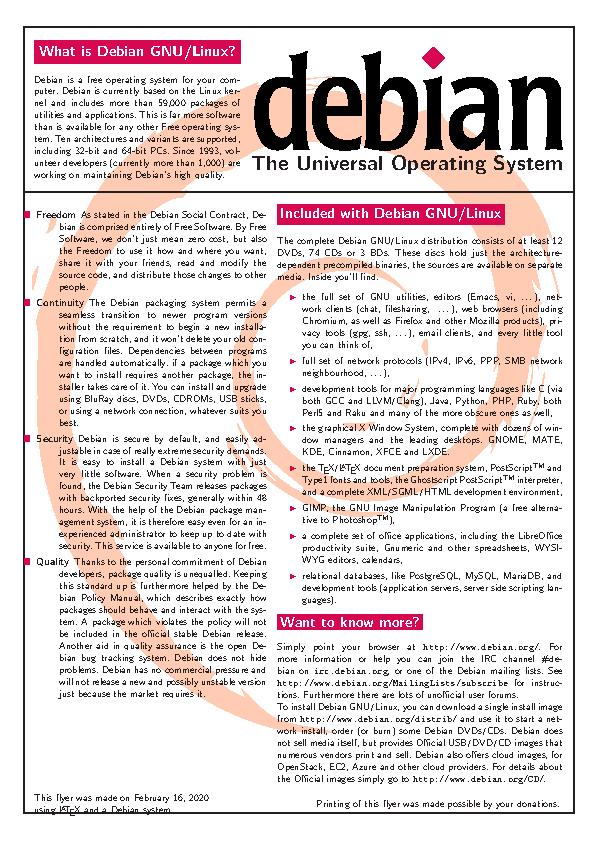 Currently, Debian Flyers are available in 9 languages and Debian Social Contract and DFSG in 3 languages.